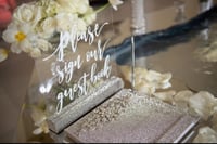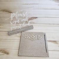 Sign measures 11x11. Book is adorned with jewels and pen holder attached. Please Allow 2-3 weeks for delivery. All sales are final.